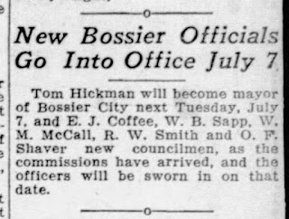 According to one historical source, it was during the term of Bossier's fifth mayor, Thomas Hickman, that many outstanding community improvements were accomplished. Among those improvements were a new city hall, a fire alarm system, the dedication of Barksdale Boulevard and the opening of the first city park.