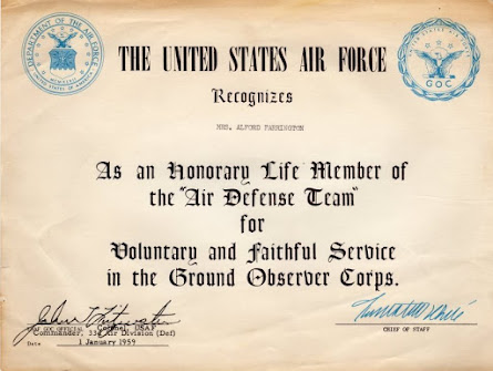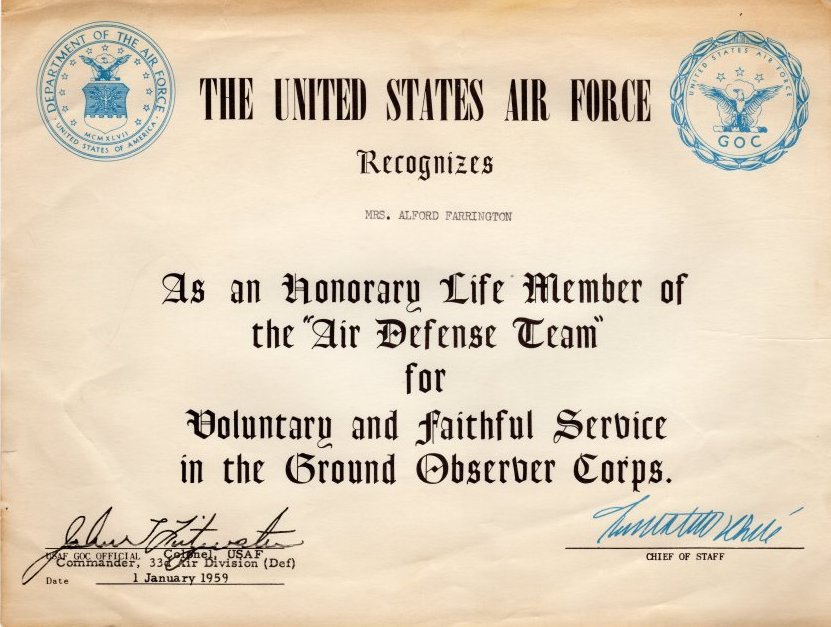 At the end of 1958, the announcement came that the Ground Observer Corps would disband on Jan. 31, 1959. Col. John T. Fitzwater, commander of the 33rd Air Division, told GOC members at a local awards banquet, “Deactivation of the Ground Observer Corps is not the end, but marks the beginning of a new national defense network. With emphasis on speed, machines can now process data faster and more efficiently that [sic] it can be done manually.”The GOC disbanded because of a new network of air defense radar stations known as the Distant Early Warning Line or Dew line controlled by the new Semi Automatic Ground Environment (SAGE) computer system. The new radar system could detect an enemy air strike force before it ever reached the nation’s continental limits. Every volunteer who earned their GOC wings was presented with a wallet ID card and a certificate from the USAF recognizing them as an honorary life member of the Air Defense Team for voluntary and faithful service in the Ground Observer Corps.