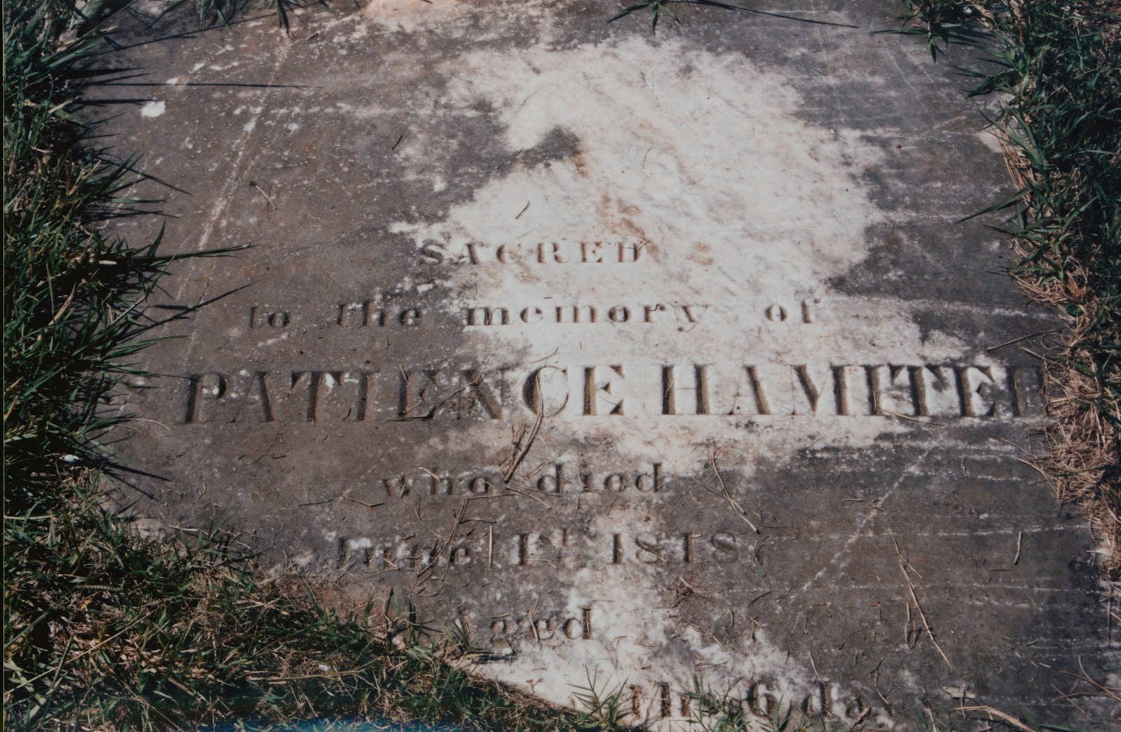 A Mrs. Hamiter pointed out that Patience Hodges Hamiter died June 1, 1848, and was buried in the family burial plot on what was then the John Hamiter plantation, but known in 1954 as the Hardy place. The 1848 death date was three years before Elizabeth Felps died.